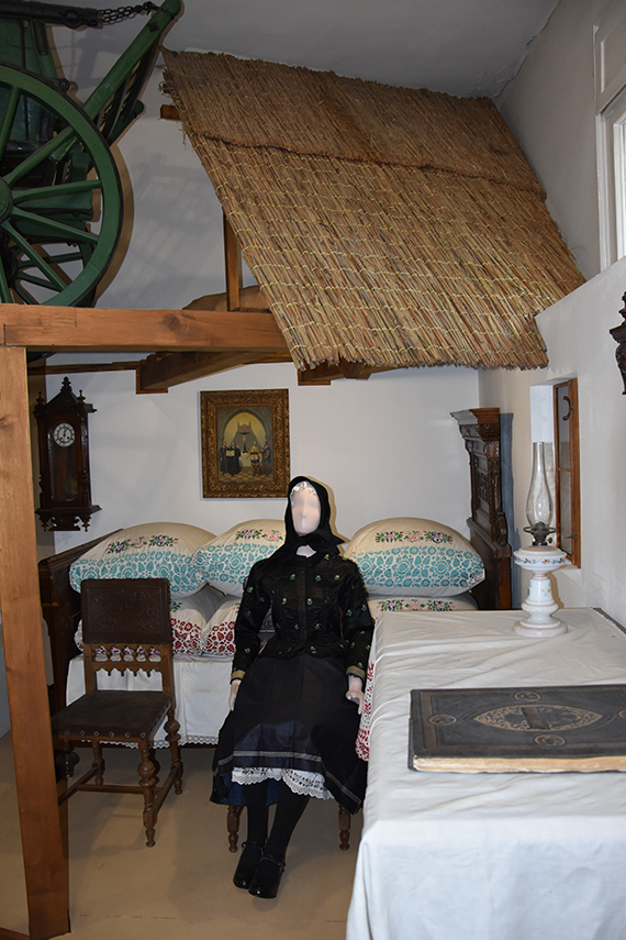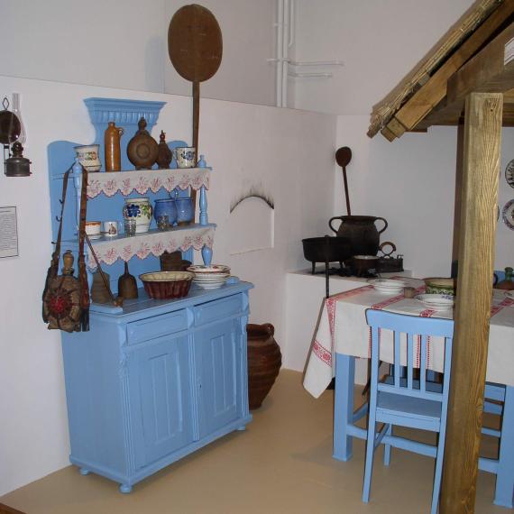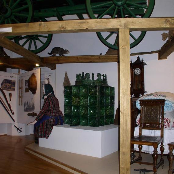 A néprajzi bemutatótermben három “metszet” látható. A mindössze 35 m2-es térben, a terem adottságai által meghatározottan, a szoba derékszögeitől eltérve egy szlovák konyharészlet és egy német szobarészlet berendezve, bútorokkal, épített tűzhelyekkel, ezközökkel, bábukon a népviselet rekonstrukciójával. Mindezek fölött egy padlásmetszet látható, aljzatán egy szekérrel. (Utalva a hajdani legények humorára, amikor a gazda távollétében szétszedték az alkalmatosságot, és a padláson összeállították.)