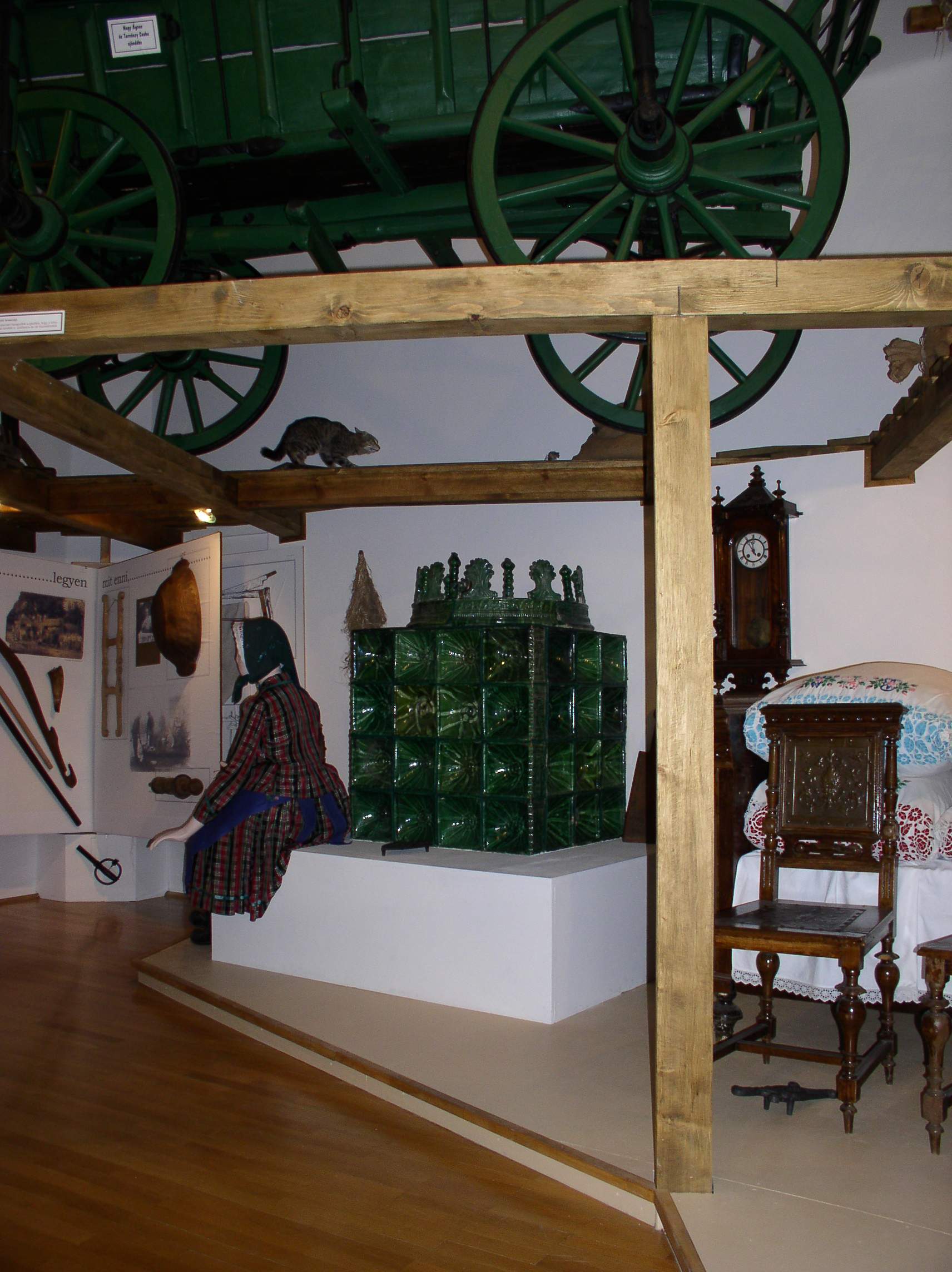 A terem szemben lévő sarkaiban két óriáskönyv, azaz nagyméretű lapozó oldalain a népi építkezés, a mezőgazdaság és táplálkozás, továbbá az öltözködés képi és tárgyi emlékei láthatóak